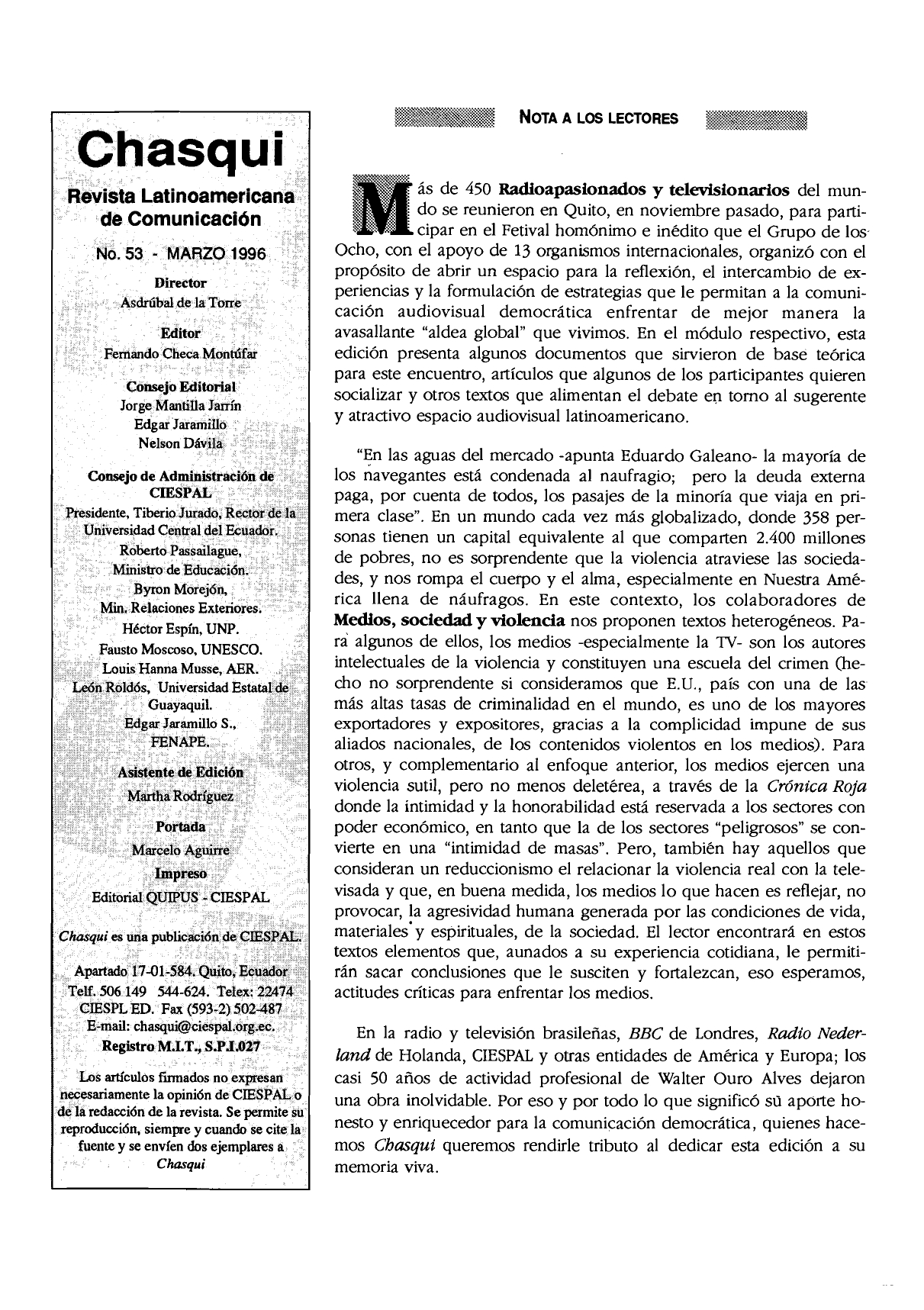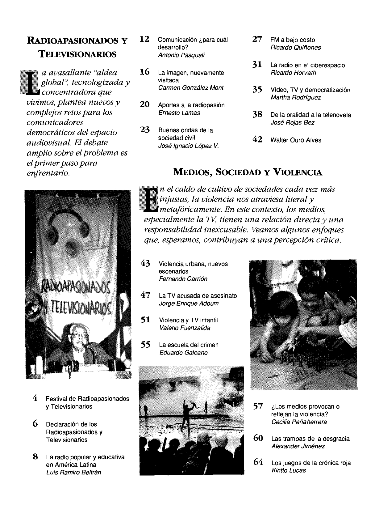 La avasallante «aldea global», tecnologizada y concentradora que vivimos, plantea nuevos y complejos retos para los comunicadores democráticos del espacio audiovisual. El debate amplio sobre el problema es el primer paso para enfrentarlo (1996).